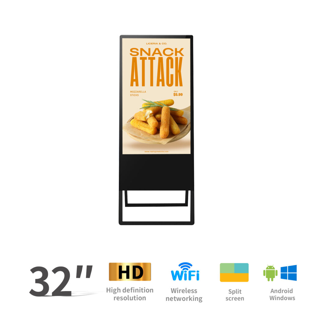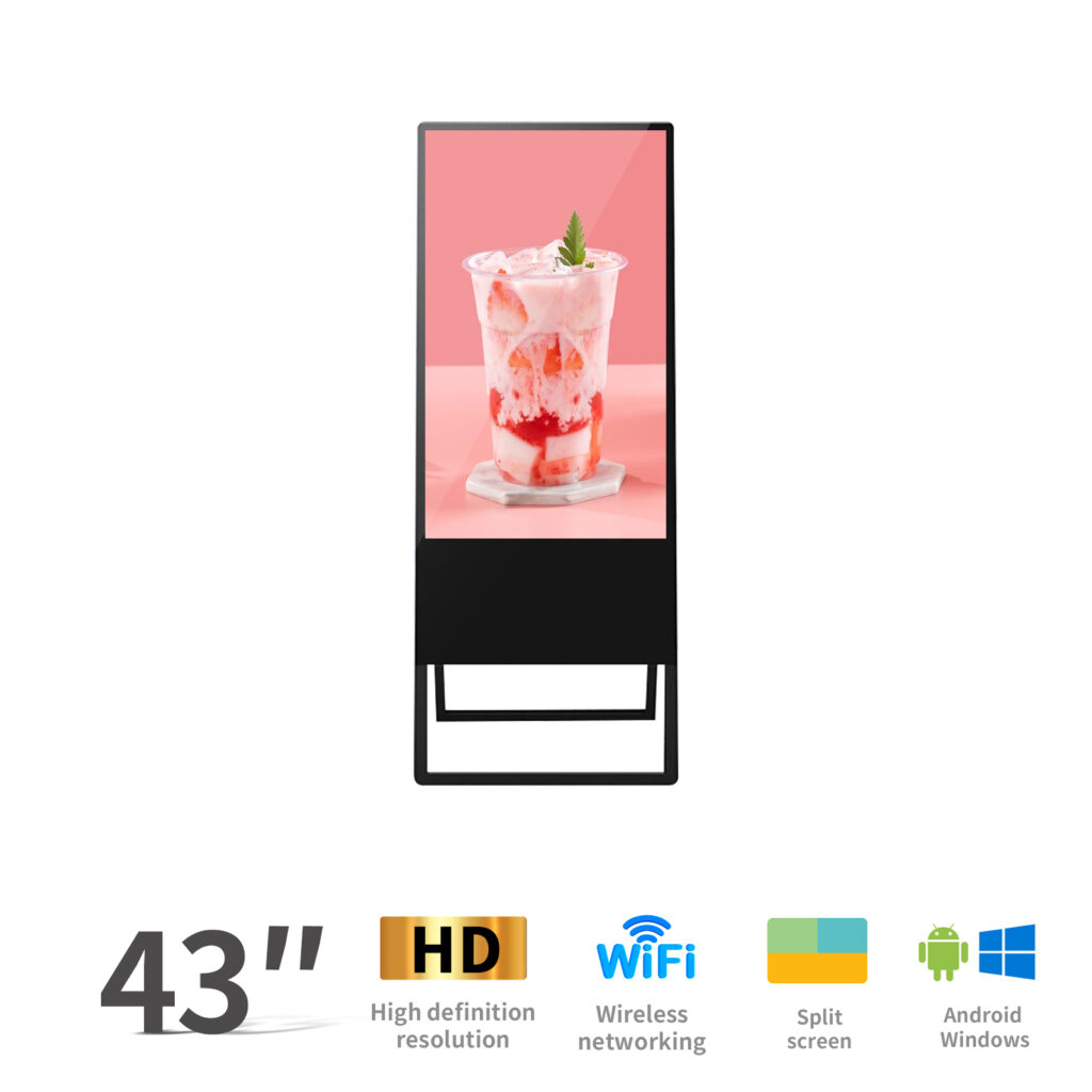 Nuestro panel publicitario electrónico tipo sándwich está disponible en tamaños de 32 y 43 pulgadas. El modelo de 32 pulgadas es ideal para cafeterías o pequeñas entradas de tiendas, ofreciendo una visibilidad que ahorra espacio, mientras que la versión de 43 pulgadas se adapta mejor a escaparates concurridos o pasillos de centros comerciales para lograr un mayor impacto visual. También ofrecemos tamaños personalizados para adaptarnos a las necesidades específicas de su proyecto.