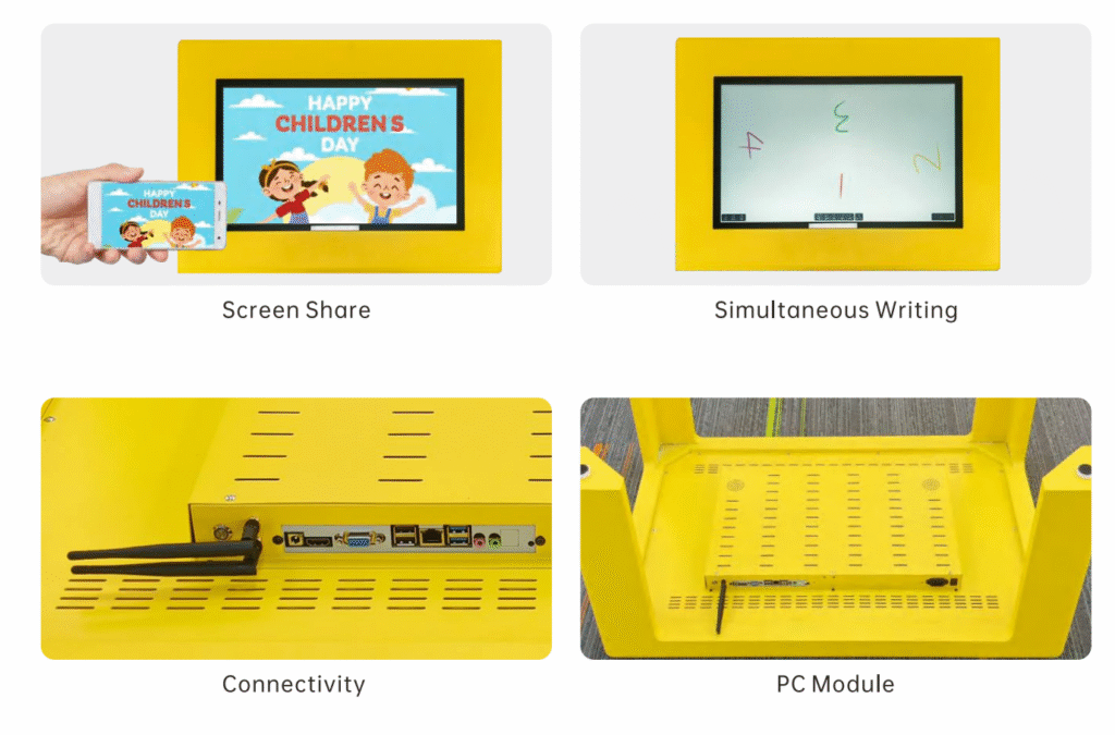 The Ikinor interactive touch table is designed to create engaging, hands-on learning and collaboration experiences. With features like Screen Share, users can instantly mirror content from mobile devices to the display, making presentations and teaching more dynamic. Its Simultaneous Writing capability allows multiple users to draw or write at the same time—ideal for classrooms, training sessions, or creative brainstorming. The table’s Connectivity module supports a variety of ports, including USB, VGA, and audio interfaces, ensuring seamless integration with different devices. Additionally, the built-in PC Module provides powerful processing performance, supporting Android or Windows systems. Together, these features make Ikinor’s touch table a smart, versatile, and durable solution for education, business, and interactive display environments.