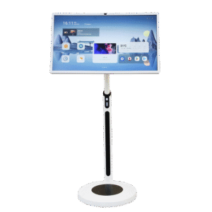 Un televisor inteligente portátil es una solución de visualización todo en uno que integra un sistema operativo integrado, conectividad inalámbrica, control táctil y una estructura móvil. Funciona de forma independiente, sin reproductores externos ni cableado complejo, y suele incluir un soporte móvil o ruedas para un uso flexible en diferentes espacios.