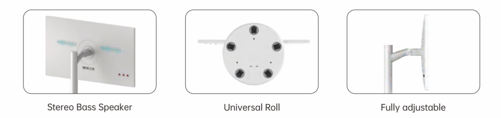 La estructura moderna y portátil con altura y rotación ajustables se adapta a diversas aplicaciones en espacios comerciales, educativos y creativos.