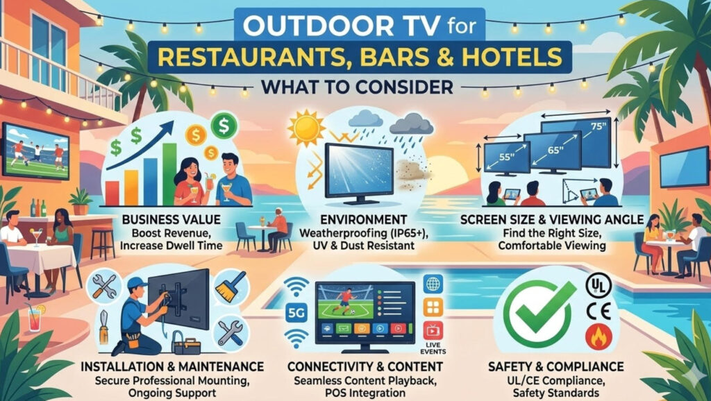 Focusing on Safety and Compliance Considerations not only protects guests and staff but also mitigates legal and operational risks while ensuring long-term stability and ROI of Outdoor TV investments.
