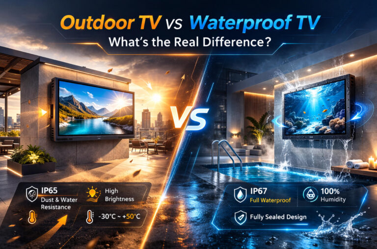Outdoor TV and Waterproof TV are often grouped together in commercial display discussions, yet they serve different technical purposes. For procurement managers, system integrators, and project planners, understanding this distinction is essential before making a capital investment. An outdoor TV is engineered for continuous exposure to open-air environments—sunlight, dust, wind, temperature shifts, and rain—while maintaining brightness and structural durability. A waterproof TV, by comparison, prioritizes moisture resistance and sealed construction, making it suitable for wet or high-humidity areas such as spas, bathrooms, or poolside zones.