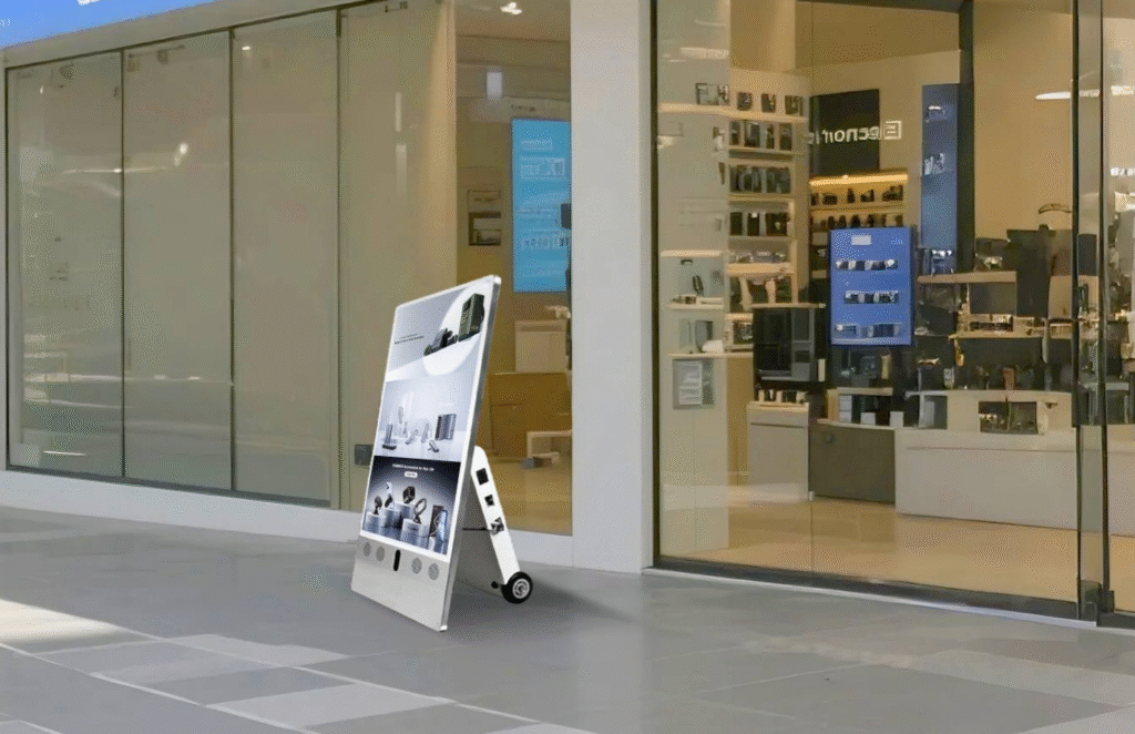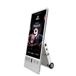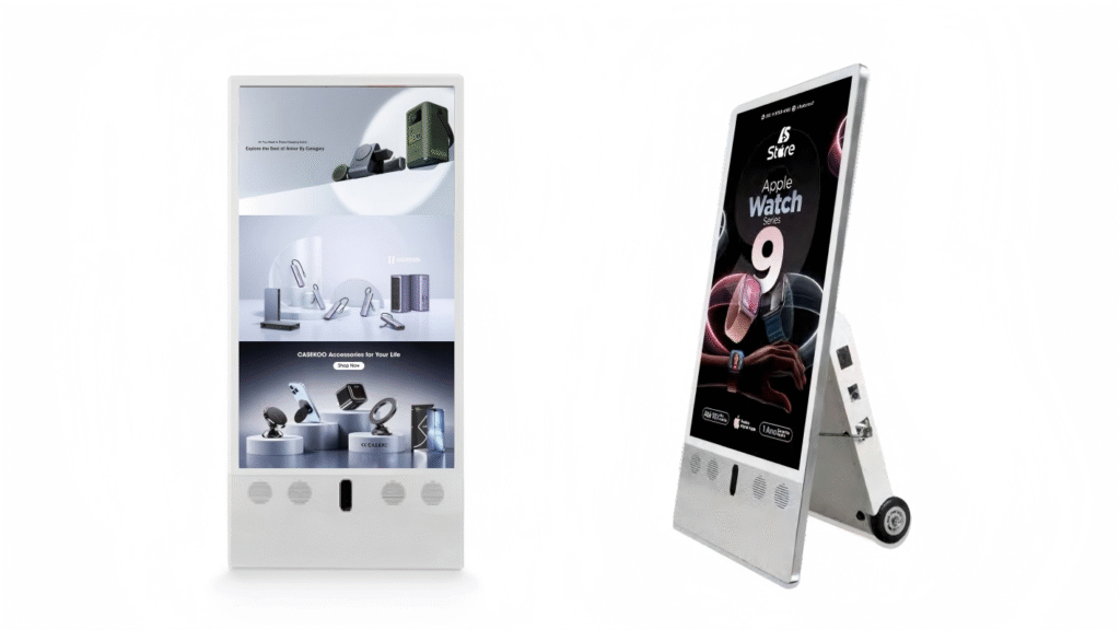 Ikinor portable digital signage display features a lightweight body, optional outdoor-ready design, and bright LED/LCD screen, making it suitable as a portable digital billboard, mobile display board, or self-standing promotional signage.