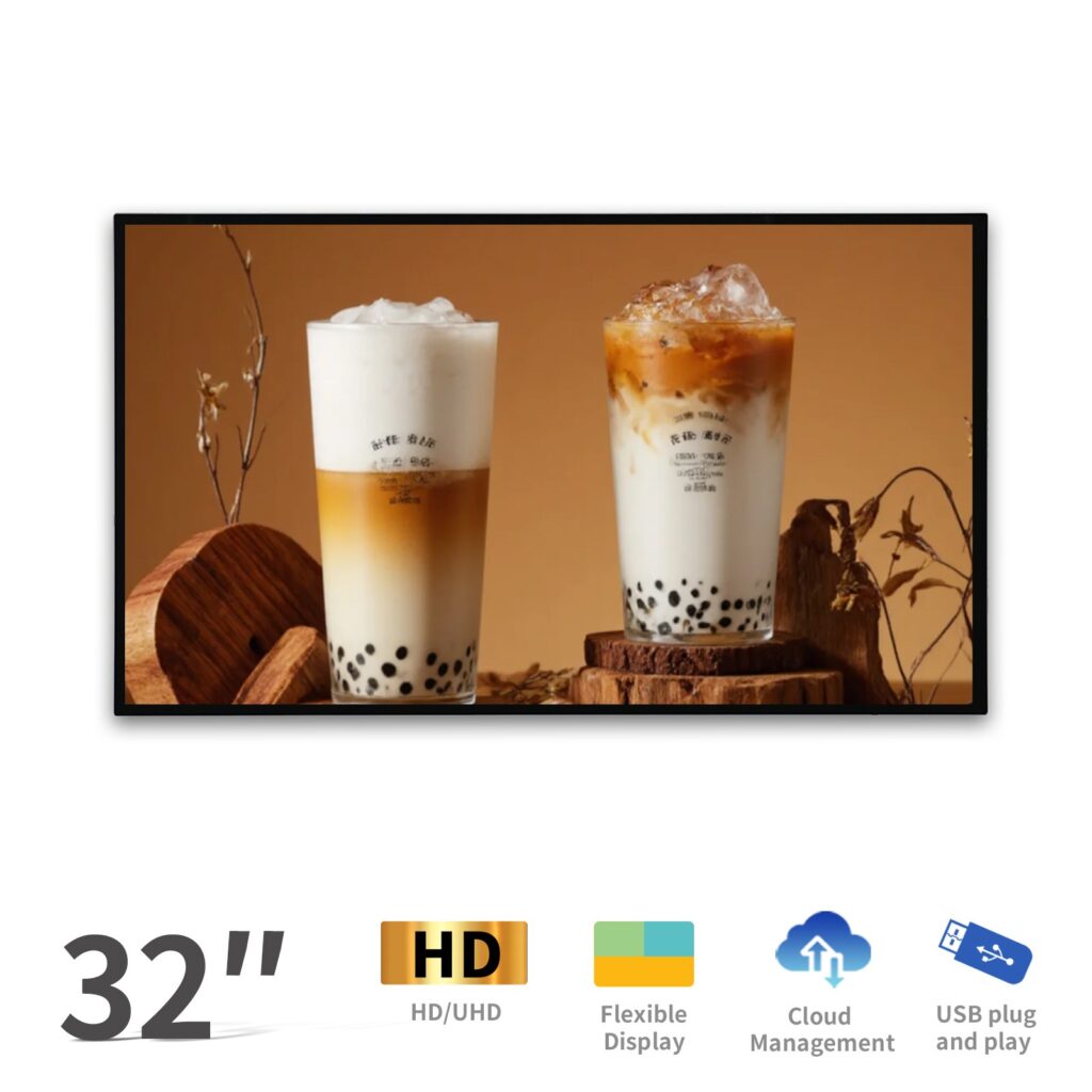 La señalización digital de 32 pulgadas (~730 × 430 mm) es adecuada para la visualización a corta distancia, ideal para estanterías de tiendas, ascensores y áreas de recepción con espacio limitado.