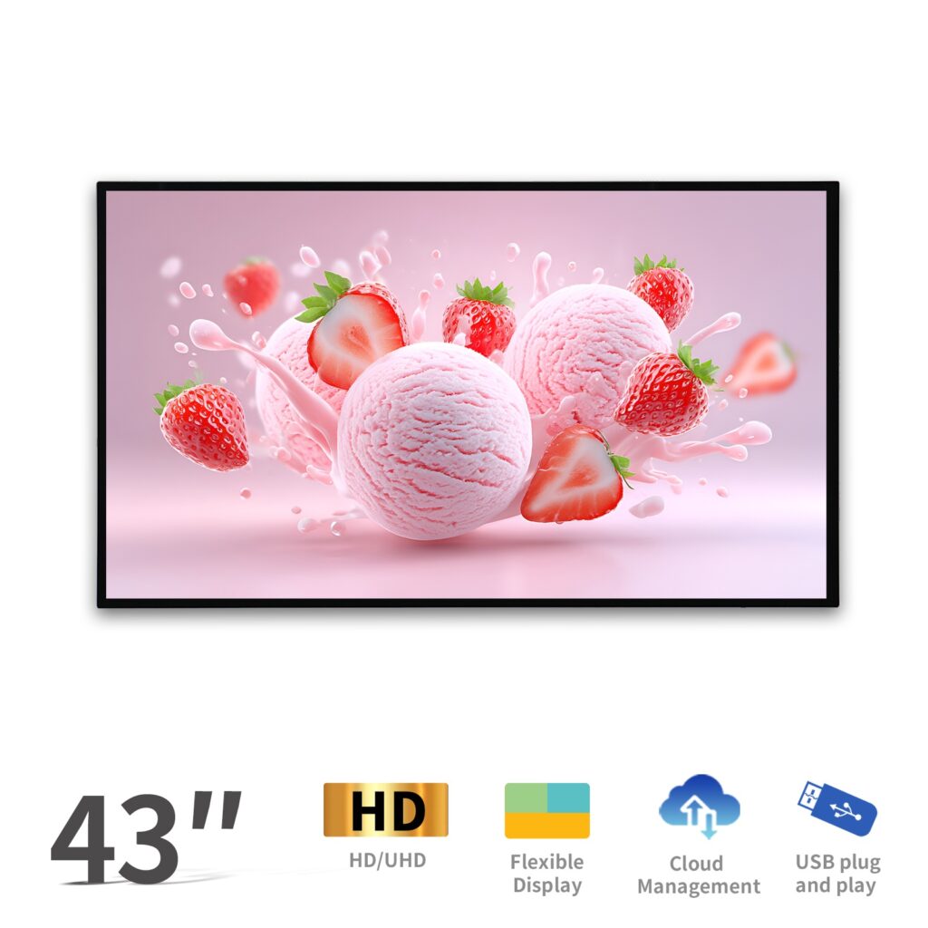 La pantalla de 43 pulgadas (~970 × 560 mm) ofrece un tamaño y una claridad equilibrados, perfectos para cafeterías, clínicas y salas de reuniones con distancias de visualización moderadas.
