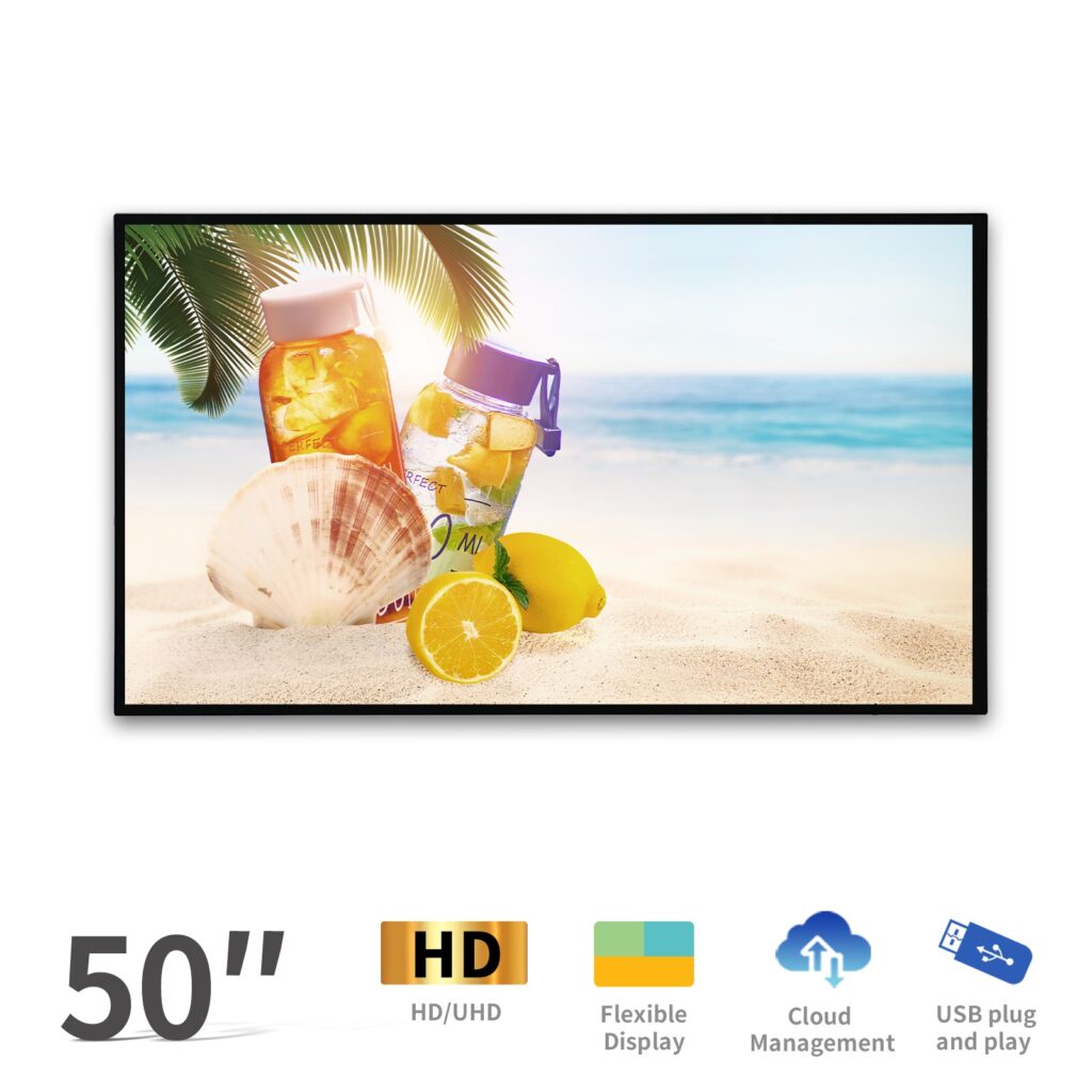 Los carteles de 50 pulgadas (~1110 × 640 mm) ofrecen una visibilidad versátil, ideal para restaurantes, zonas de espera y vestíbulos de hoteles que necesiten mostrar contenido atractivo.