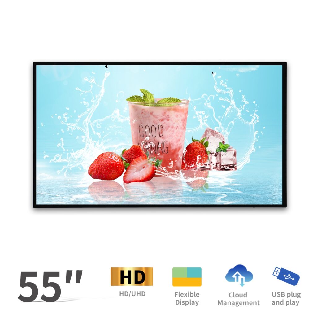 La pantalla de 55 pulgadas (~1230 × 710 mm) ofrece imágenes de gran impacto, ideales para centros comerciales, aeropuertos y vestíbulos corporativos con distancias de visualización mayores.
