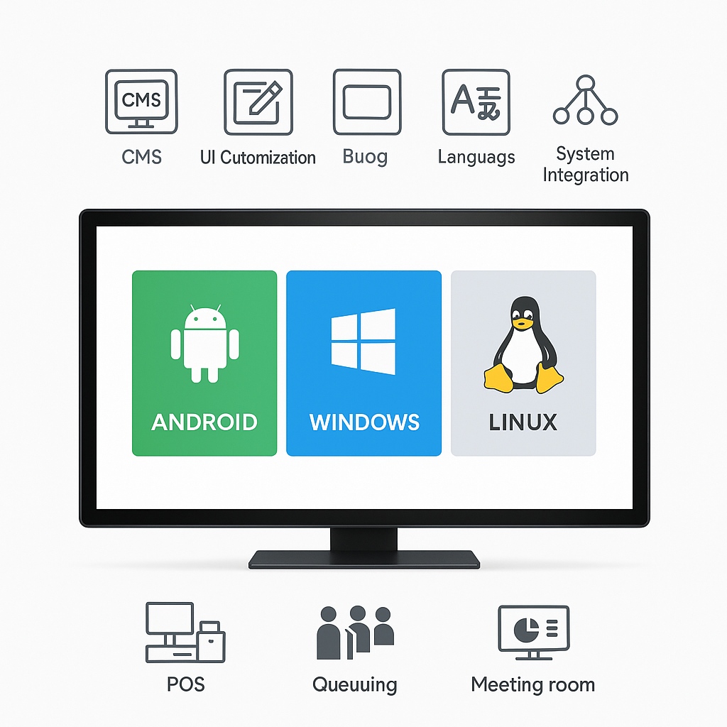 Choose Android, Windows, or Linux with custom UI, workflows, CMS, and API integrations to match your operational needs and industry-specific functions.