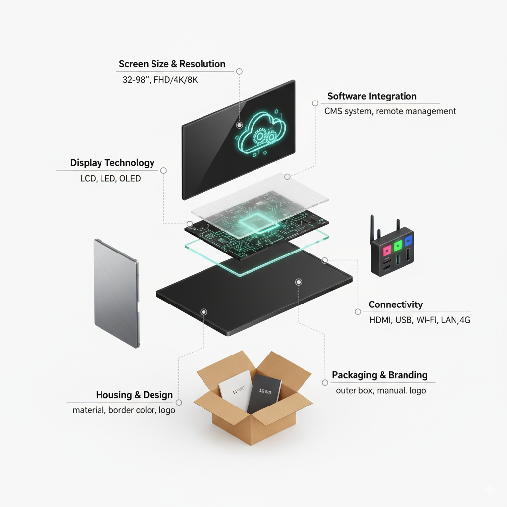 China-based digital signage manufacturers are widely recognized for their strong OEM / ODM capabilities, allowing global buyers to move beyond off-the-shelf products and build fully customized display solutions. Typical customization starts with branding elements, including logo printing on bezels, startup boot logos, UI skins, and customized packaging designed for retail or project delivery.