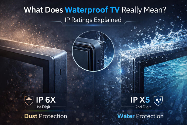 In commercial display projects, the term “Waterproof TV” is often used broadly, but its real meaning depends heavily on the IP rating behind it. For B2B buyers, a Waterproof TV is not simply a screen that resists splashes — it is a device engineered to prevent dust and water intrusion under defined testing standards. This is where the IP (Ingress Protection) code becomes critical. Ratings such as IP65, IP66, IP67, or IP68 specify the level of protection against solids and liquids, directly influencing installation safety, durability, and maintenance costs. However, IP numbers are frequently misunderstood or oversimplified in procurement discussions. To make informed decisions, buyers must understand both what a Waterproof TV truly represents and how its IP rating translates into real-world performance.